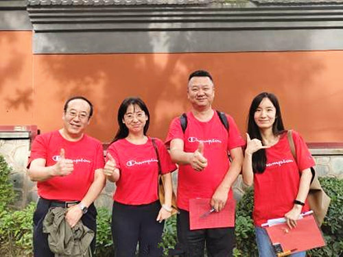 青岛十七中三位老师身着印有“必胜”字样的短袖在青岛旅游学校考点外为考生们加油助威。