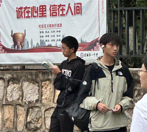 昆一中门口,有同学正在抓紧时间复习知识点。