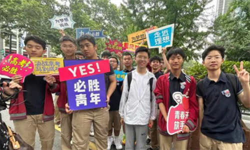 南京九中考点门口,九中高一年级的学生自发组织起来,给高三的学长和学姐加油!