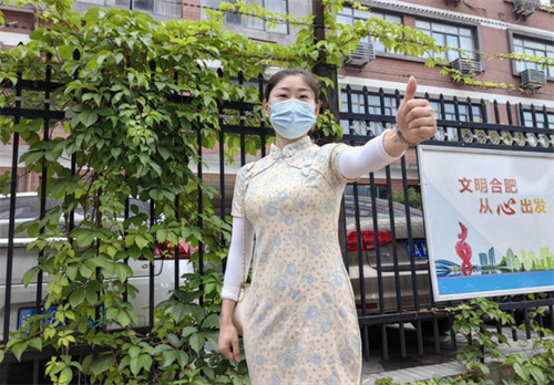 合肥48中滨湖校区考点,家长今天特意换了一套旗袍,为孩子加油。