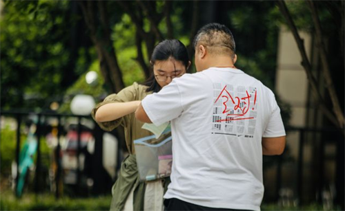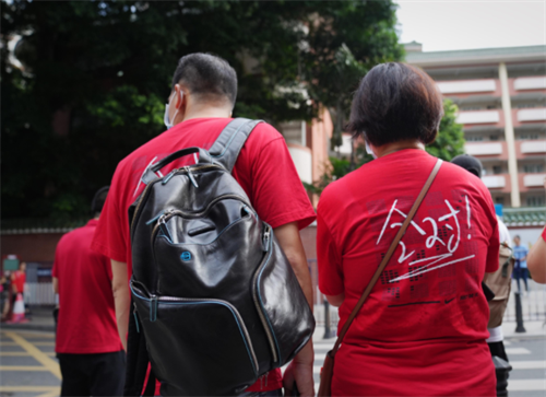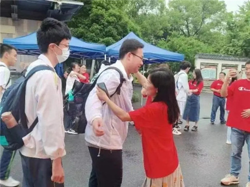 老师们统一身穿红衣,为考生们送考。每进来一位考生,老师们都会送上拥抱,给予最真挚的祝福。