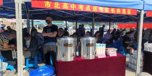 北高中家长休息区内,贴心为等候家长准备了酸梅汤和防暑用品。
