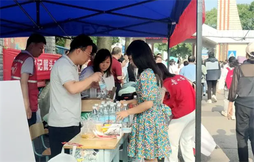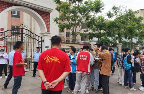 湘潭市三中考点外,志愿者为考生和送考家长发放免费物资。