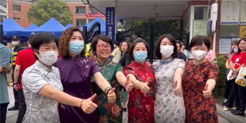 杭二中考点,送考的妈妈们很有默契得穿上了旗袍:“祝孩子们,旗开得胜,金榜题名,一举夺魁。”
