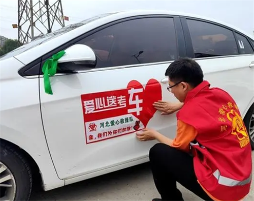 爱心救援队队员将“爱心送考车”的车贴贴在车侧门,还将“河北爱心救援队送考车”的条幅贴在车头,以方便考生辨认。