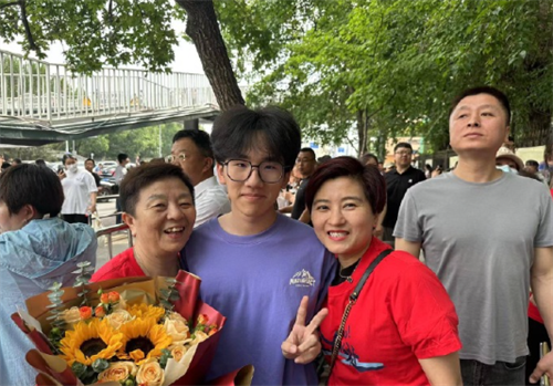 考生家长手拿着向日葵花等待考场内的孩子,希望他能发挥出自己最好的水平。