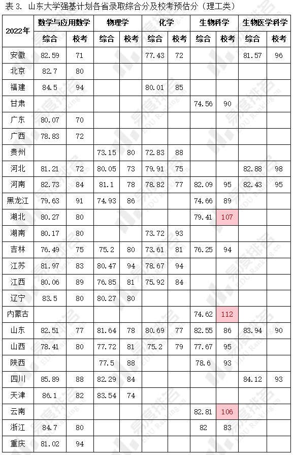 北京、浙江两省校测预估分均在100分左右,这两省压线考生被录取的概率较小;山东、河北两省由于入围分数较高的原因,大大拉低了校考预估分;吉林省入围分、综合分、校考预估分均较低,其强基计划的录取难度小于其他省份。