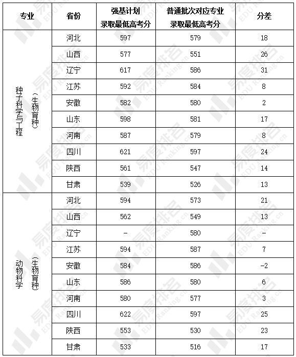 表 1 西农大强基计划与普通批次录取者最低高考分及分差