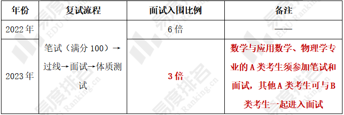 面试入围名单由划定的笔试合格线确定,笔试合格线按照分省分专业计划数的N倍划定,2023年面试入围比例也从6倍调整为3倍。原定所有A类考生均参加复试笔试+面试,2023年仅