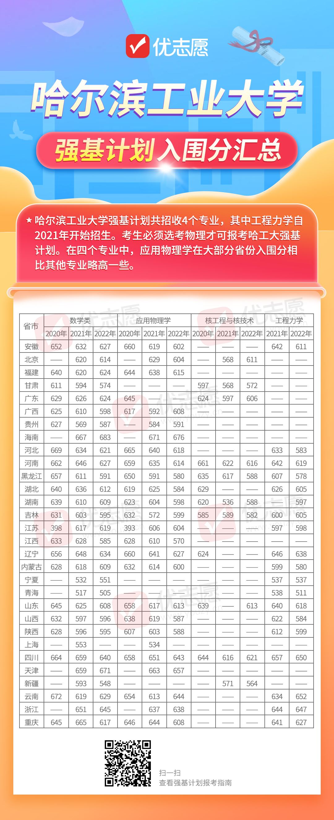 近日各高校强基计划招生简章陆续发布中,为了帮助考生更好地选择院校与专业,小优为大家汇总了哈尔滨工业大学强基近3年的入围分,大家可以根据历年数据与自身情况进行报考。注:如果高校在该省份当年没有招生或者没有公布入围分数线将用“—”表示。