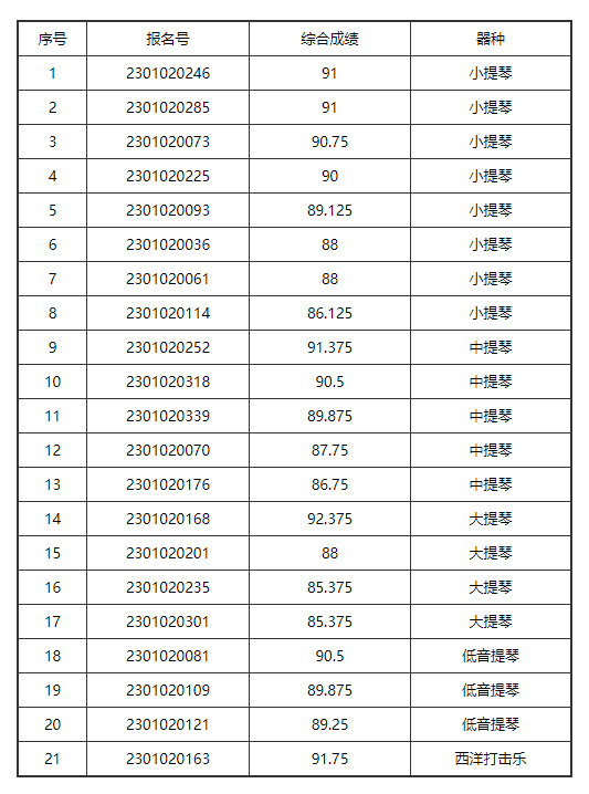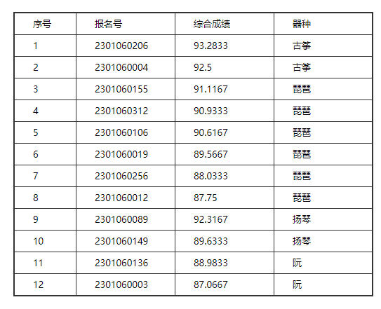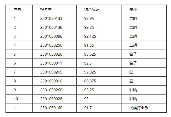 音乐表演(管乐)音乐表演(弦乐)音乐表演(钢琴)音乐表演(民乐-拉弦吹打)音乐表演(民乐-弹拨)音乐表演(少数民族乐器)音乐表演(声乐)作曲与作曲技术理论音乐学音乐学(民族班)音乐表演(民族艺术英才班声乐)音乐表演(民族艺术英才班器乐)