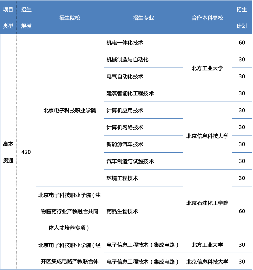 由入选“北京市特色高水平职业院校”的高职院校与本科高校联合培养。前5年在高职院校学习,后2年在本科高校学习。完成前5年学业且成绩合格者由高职院校颁发专科学历证书,完成全部学业且成绩合格者,由合作本科高校颁发本科学历证书(专升本)。高本贯通个别项目可由本科高校独立承担所有学段培养任务,具体情况以当年北京教育考试院公布的招生简章为准。