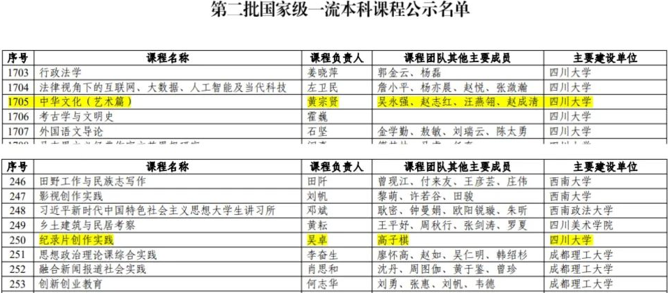 2023年4月11日,教育部发布《关于第二批国家级一流本科课程认定结果的公示》,拟认定5751门课程为第二批国家级一流本科课程。其中,线上课程1095门,虚拟仿真实验教学课程472门,线上线下混合式课程1801门,线下课程2076门,社会实践课程307门。此次公示,学院共有2门课程获得国家级一流本科课程认定,学院黄宗贤教授主讲的《中华文化(艺术篇)》入选线下一流课程,学院吴卓副教授主讲的《纪录片创作实践》入选社会实践一流课程。