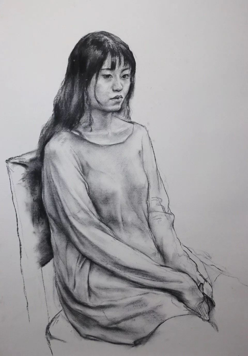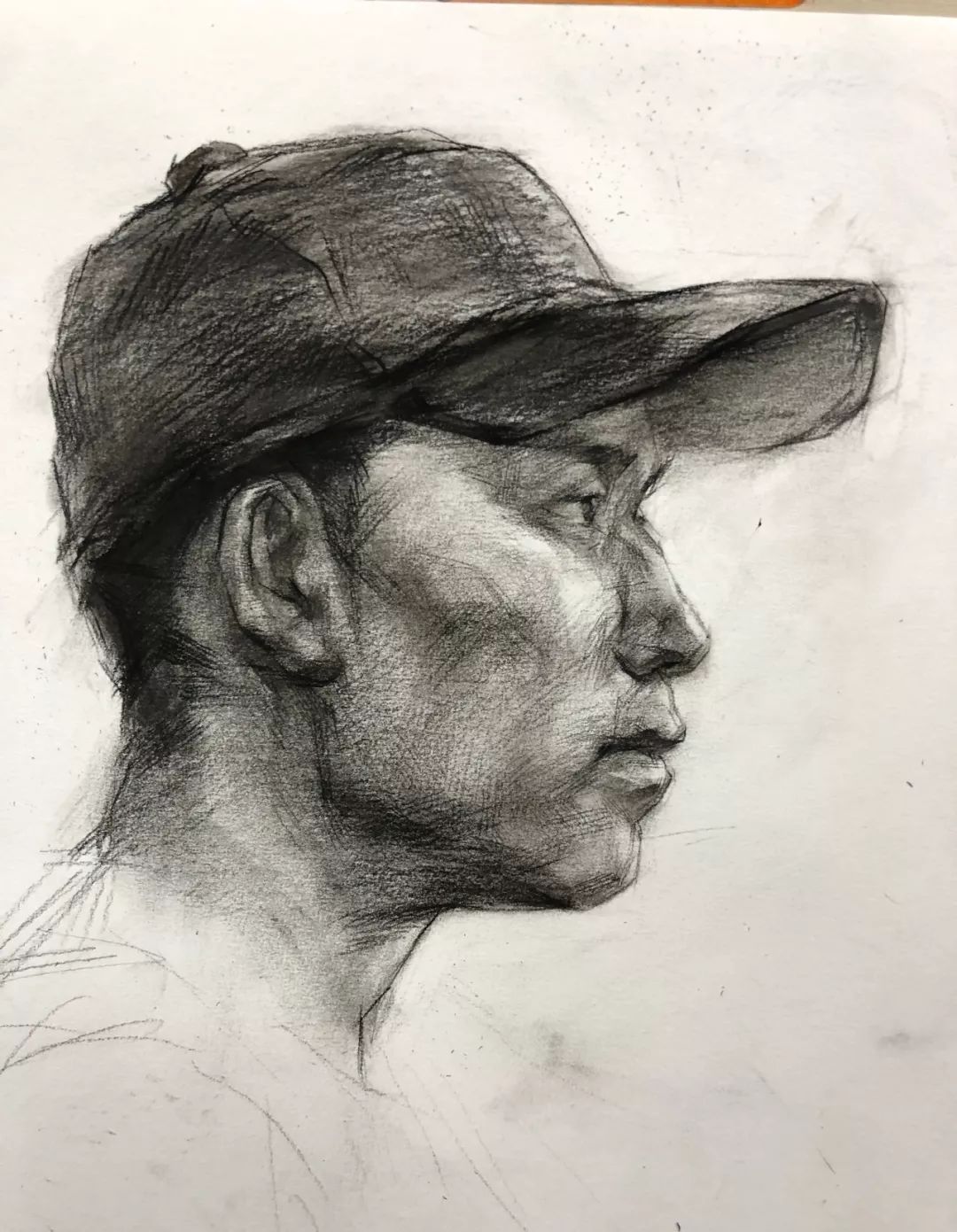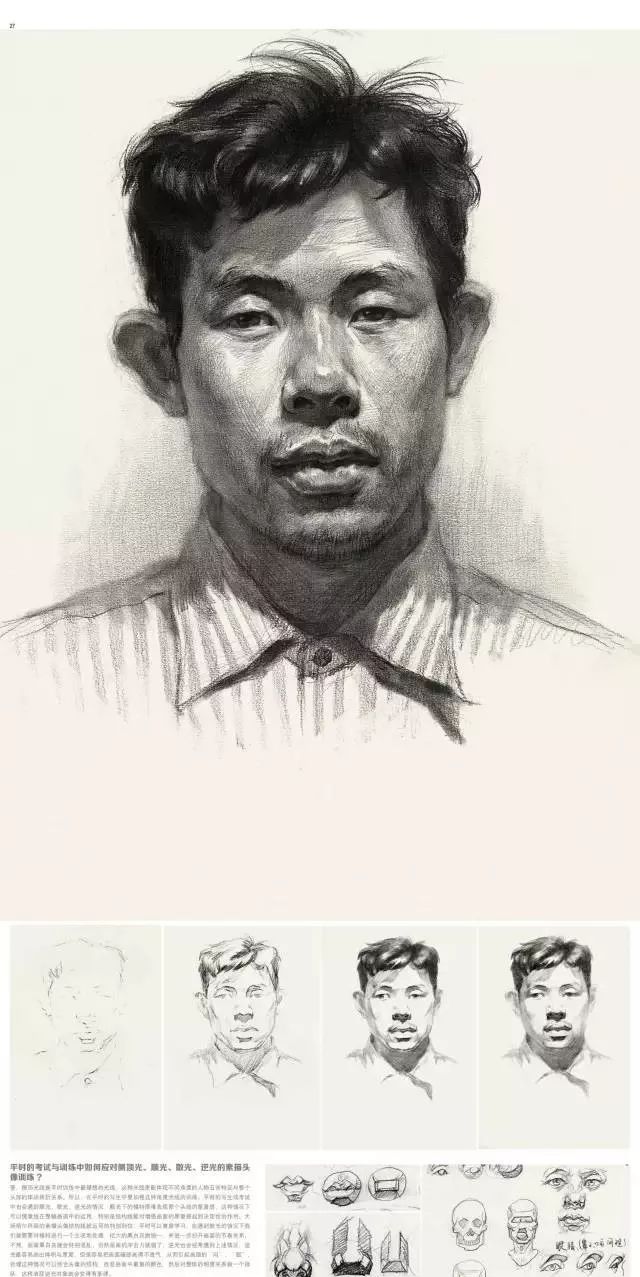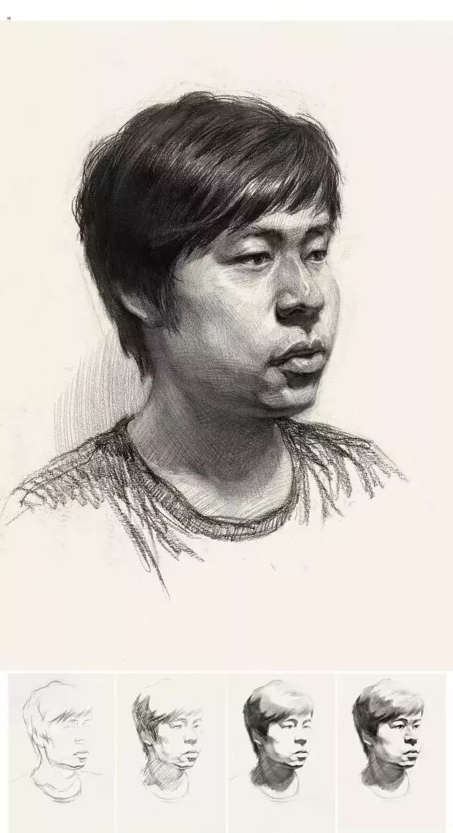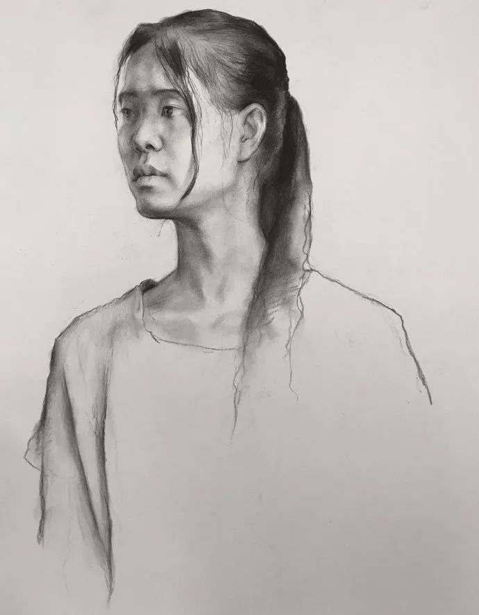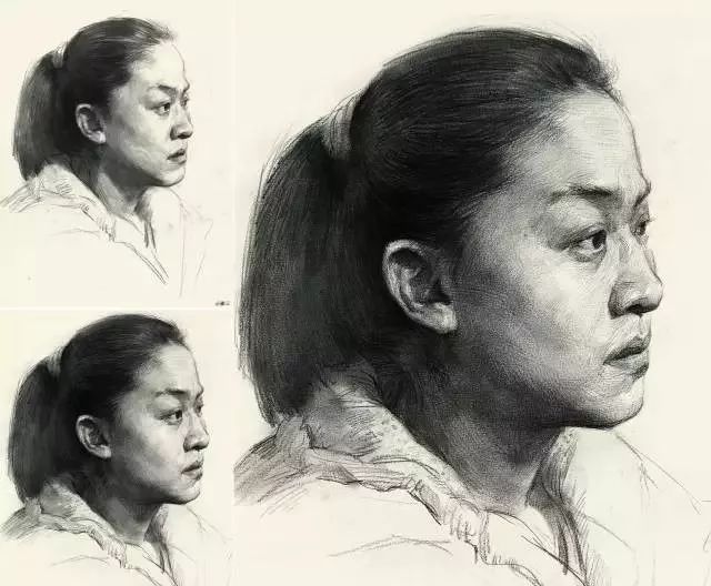 注意头部顶面侧面底面几个大面的交代,这几个大面之间的转折部分多刻画,显现出面与面的转折。可以多练一些比较小的头像练习,不能刻画细节的那种。这样注意力可以集中在头部的整体空间上。