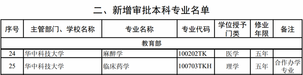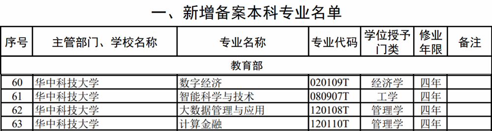 近日,教育部网站发布《教育部关于公布2022年度普通高等学校本科专业备案和审批结果的通知》开展了2022年度普通高等学校本科专业设置和调整工作,增补了近年来批准增设、列入目录的新专业。华中科技大学增设6个新专业,4个备案本科专业是数字经济、智能科学与技术、大数据管理与应用、计算金融,2个审批本科专业是麻醉学、临床药学(中外合作办学)。