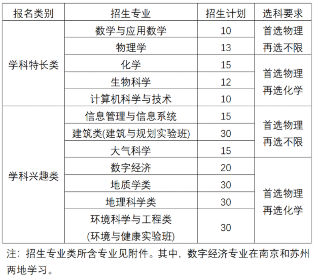 符合2023年普通高等学校招生全国统一考试报名条件,学业成绩名列前茅或基础学科拔尖的江苏省普通高中毕业生。考生选考科目应符合报考专业科目要求,身体条件还须符合《普通高等学校招生体检工作指导意见》要求及有关补充规定。报名考生分为以下两类: