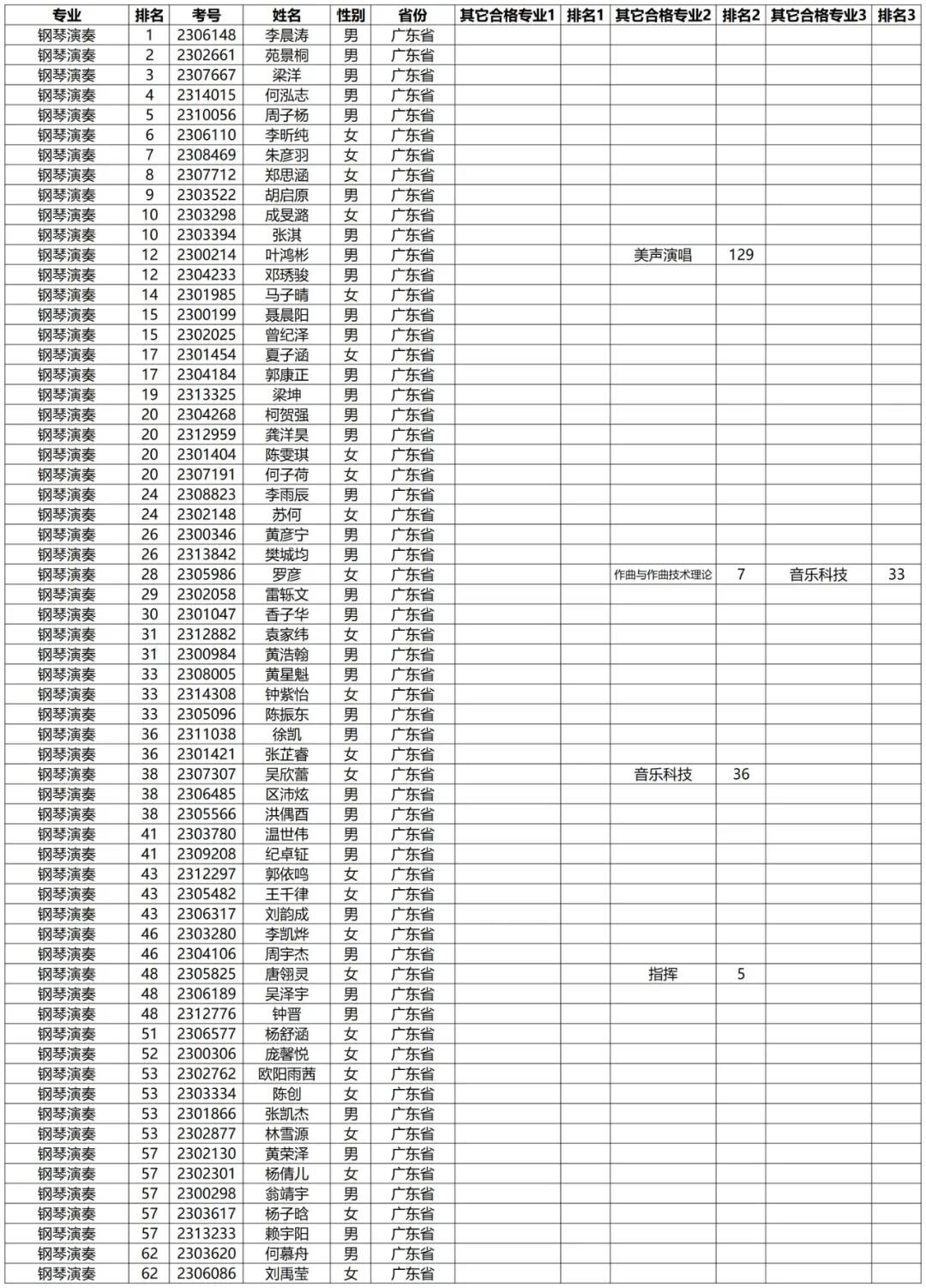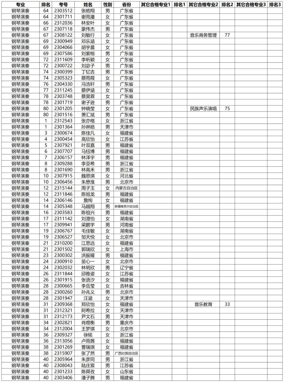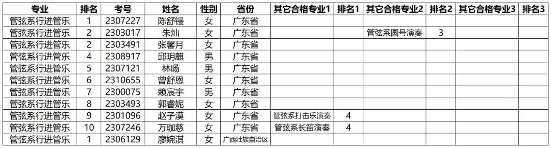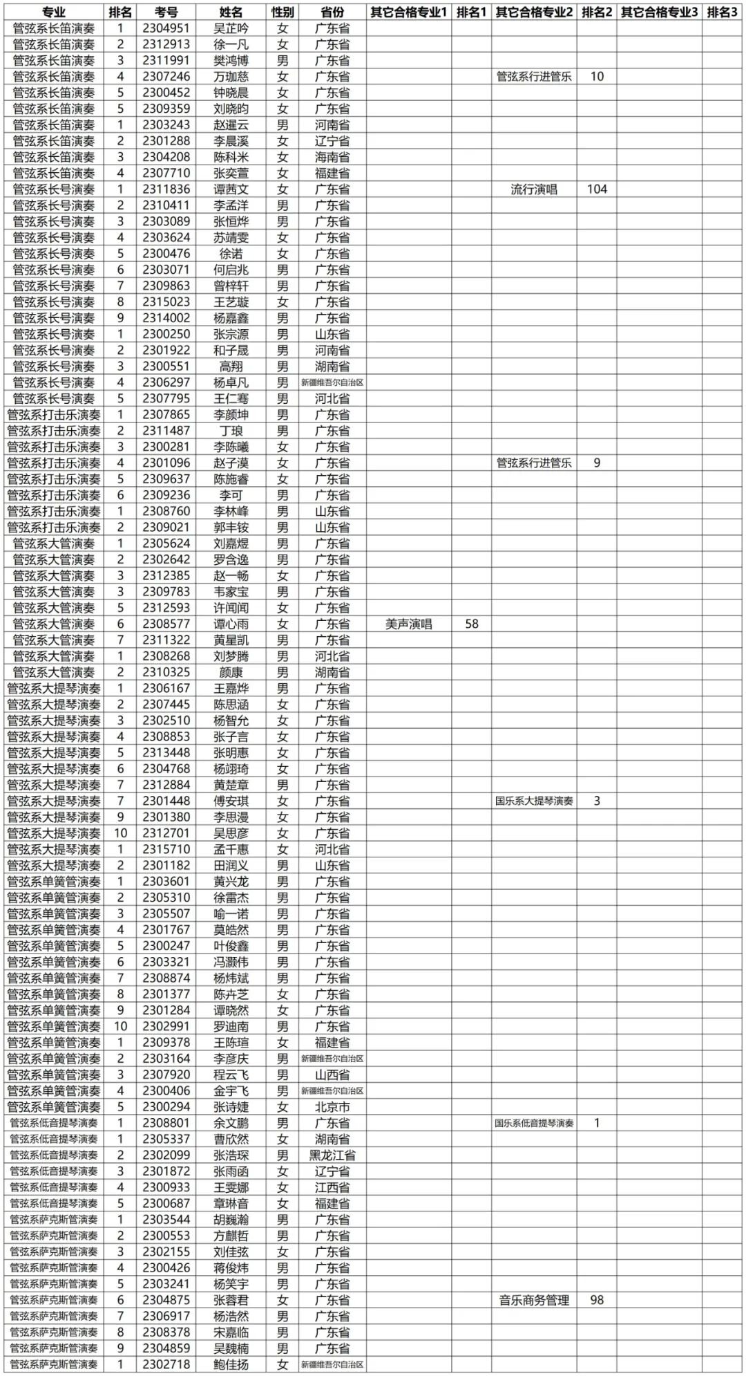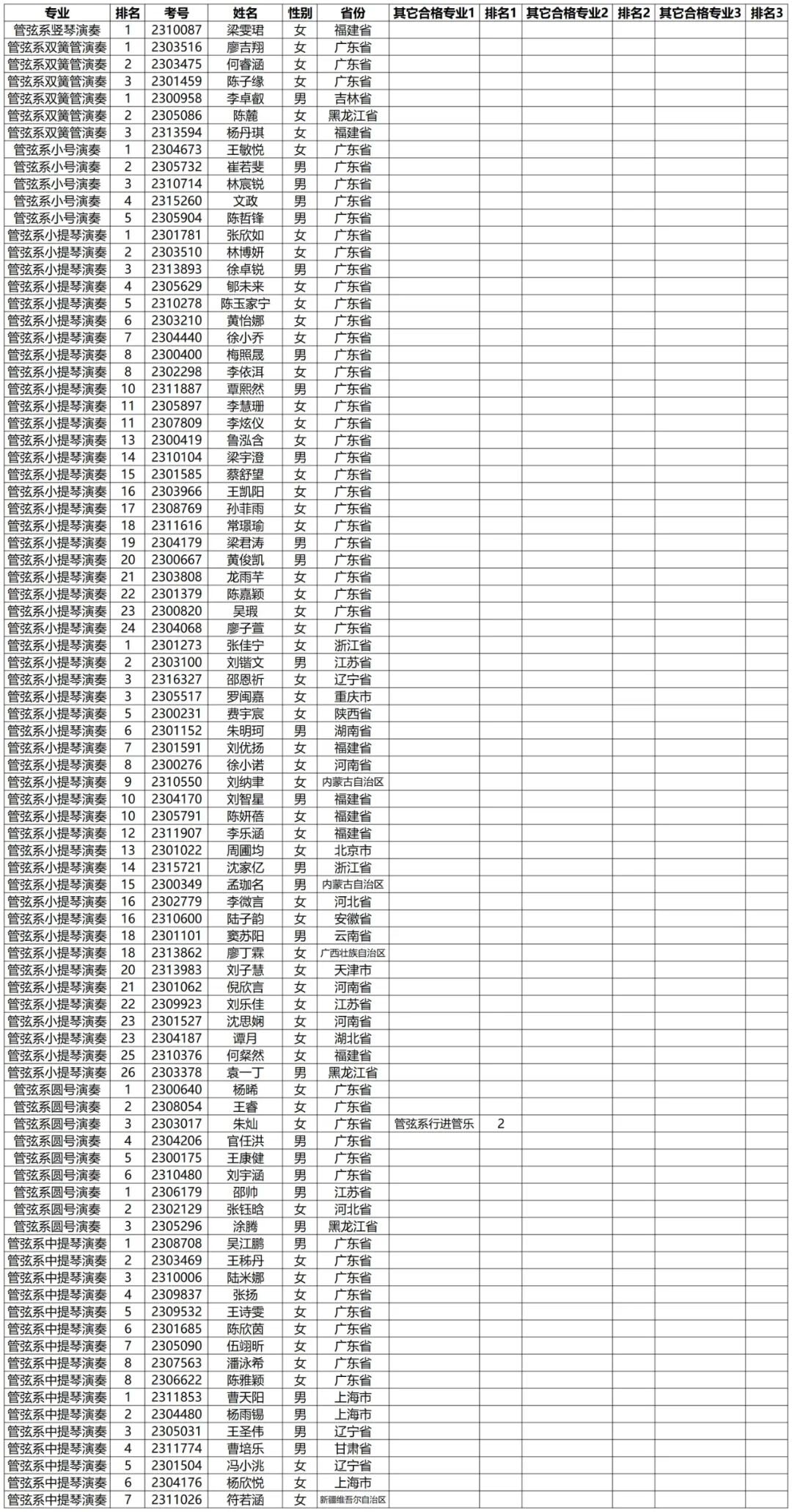 星海音乐学院2023年本科招生考试各专业合格考生名单现予公布,考生可登录我校招生网http://zs.xhcom.edu.cn或微信公众号“星海音乐学院招生办”报名缴费系统查询本人专业考试成绩。钢琴演奏:管弦乐器演奏:行进管乐:点击查看更多