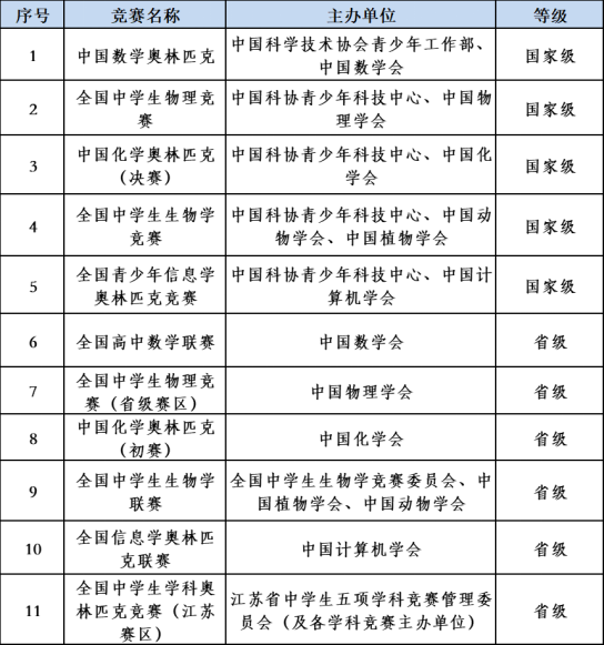 3.特殊才能类。符合我校特殊人才培养需求的学生:以教育部公布的2022—2025学年全国中小学生竞赛活动名单和江苏省教育厅公布的2022—2025学年全省中小学生竞赛活动名单(见附件)为准,要求高中阶段在各类竞赛中获得省级二等奖及以上;或经我校审查认可的在某一学科领域具有特殊才能者(须附详细证明材料)。