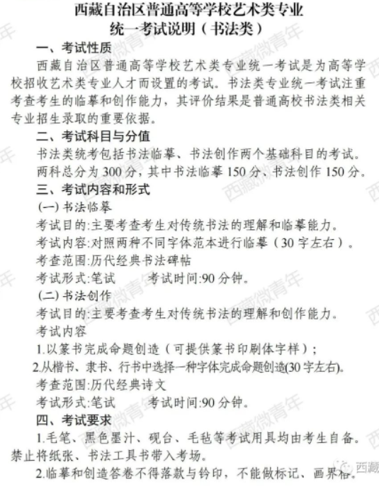 西藏自治区普通高等学校艺术类专业统一考试说明(书法类)