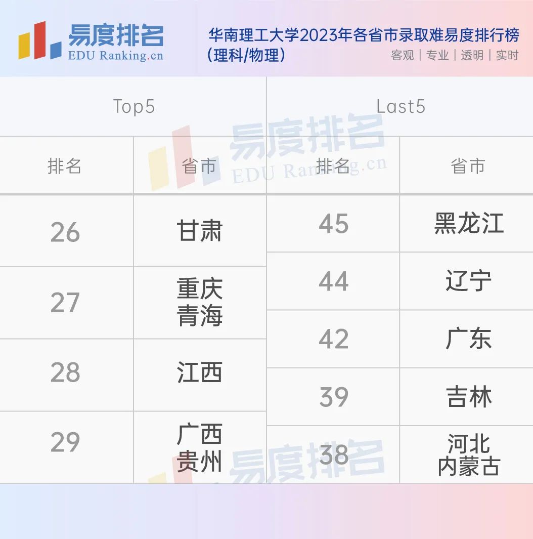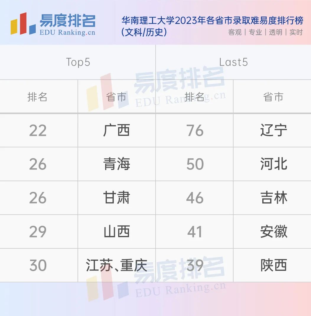 华南理工大学在“2023年各省市录取难易度排行榜”中的排名前五和最后五名的省市。相比较理科/物理方向,各省市在文科/历史的排名差距相差更大。华南理工大学在广东省的录取难易度在物理和历史方向分别为42名和38名。