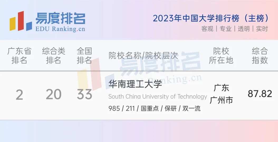 华南理工大学在“2023年中国大学排行榜(主榜)”中的名次,根据官方显示,华南理工自2020起更新为综合类院校,连续三年稳居20名。虽然华理工不是985中的佼佼者,在全国排名中,一直保持着稳定发挥。