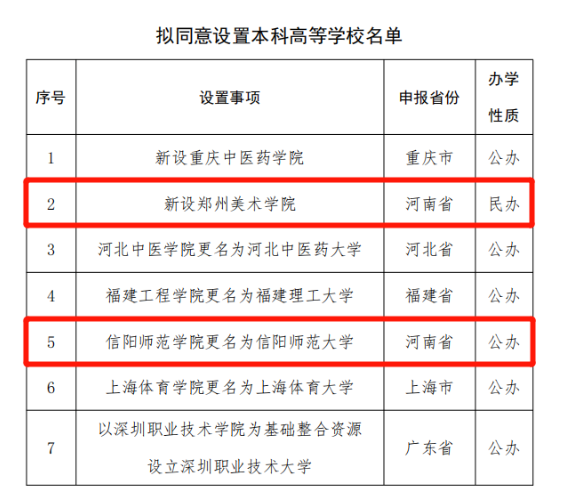 5月22日教育部发布《关于拟同意设置本科高等学校的公示》,其中包括信阳师范学校更为名