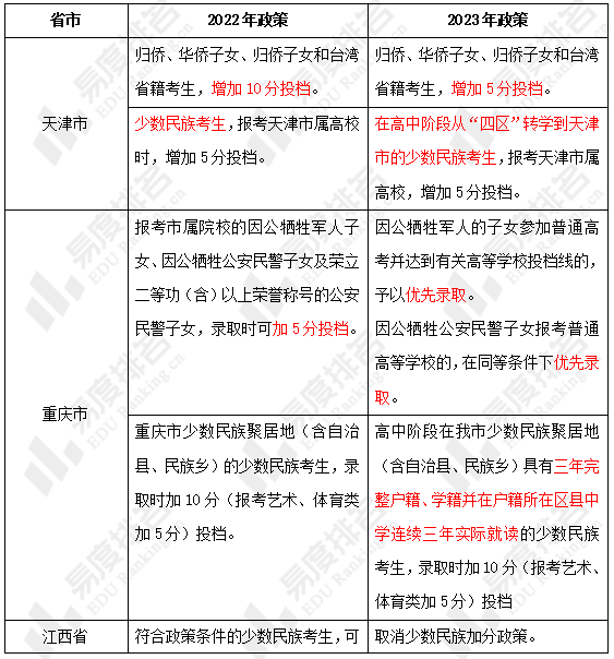 重庆市2023年因公牺牲军人子女、因公牺牲公安民警子女的公安民警子女在投档时不再享受加分政策,此政策改为投档时优先录取。同时该市2023年缩小