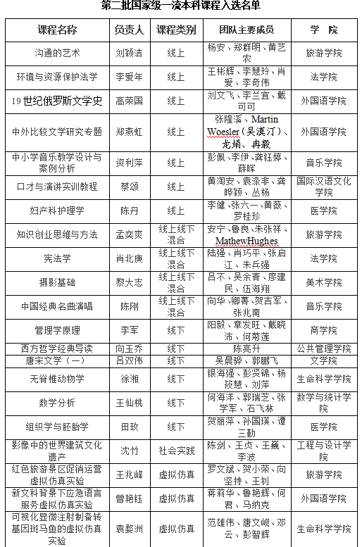 近日,《教育部关于公布第二批国家级一流本科课程认定结果的通知》(教高函〔2023〕7号)正式下发,认定5750门课程为第二批国家级一流本科课程。我校新增21门课程,其中线上一流课程7门,线上线下混合式一流课程4门,线下一流课程6门,社会实践一流课程1门,虚拟仿真实验教学一流课程3门。
