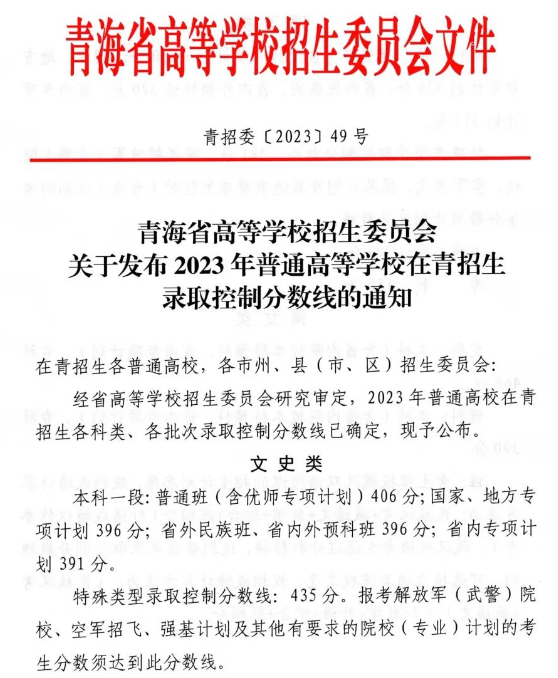 文章来源:青海省教育招生考试 青海省高等学校招生委员会关于发布2023年普通高等学校在青招生录取控制分数线的通知