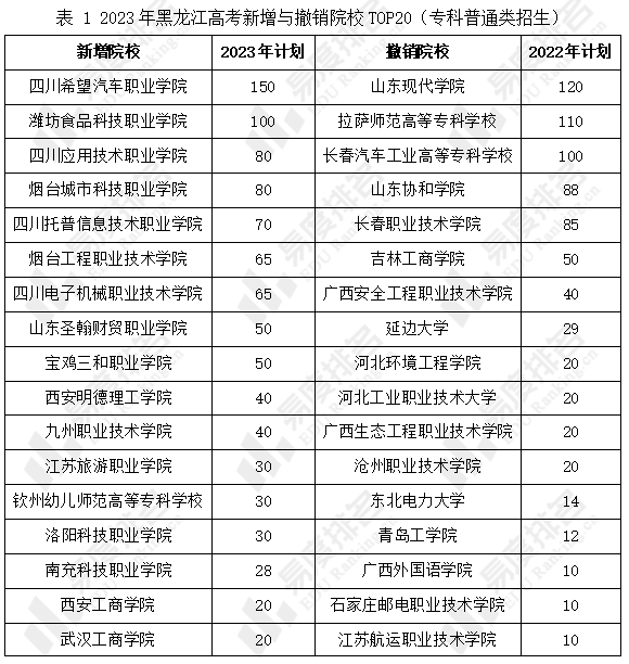2023年新增45所高校在黑龙江招生,新增院校2023年招生总计划为1272,其中四川希望汽车职业学院的招生计划数最多,为150人;2023年黑龙江高考专科招生院校撤销27所,撤销院校2022年招生总计划为815,其中山东现代学院的招生计划数最多,为120人。