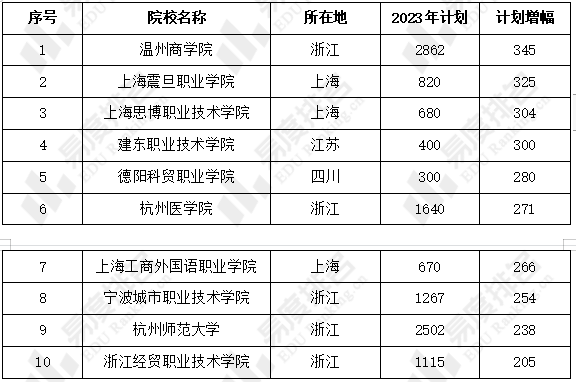 2023年共有439所高校增加了近1.4万个招生计划,其中温州商学院计划增幅最高,该校较上年共增加345个计划数。在扩招TOP10院校中,半数为省外院校。