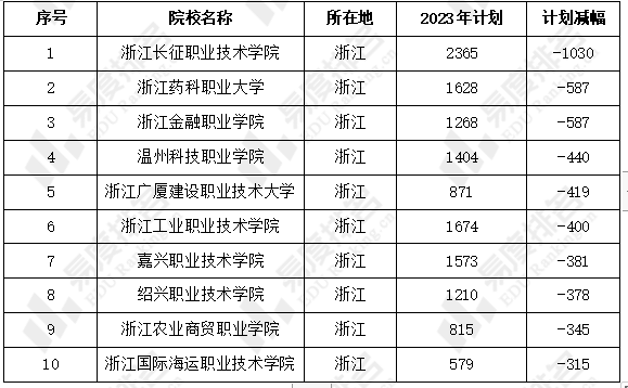 2023年共有225所高校减少了超9000个招生计划,其中浙江长征职业技术学院计划降幅最高,该校较上年共减少1030个计划数。在缩招TOP10院校中,并无省外院校。