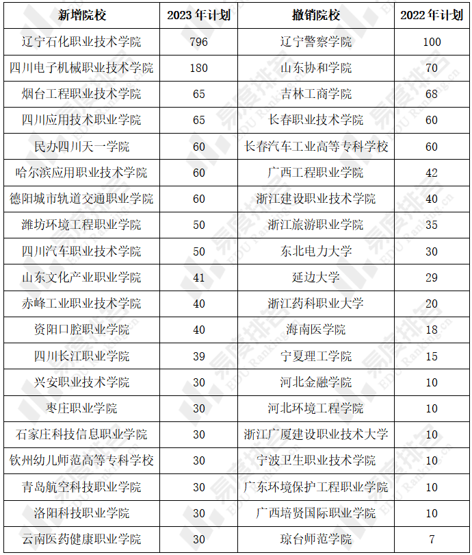表 1 2023年辽宁高考新增与撤销院校TOP20(专科普通类招生)