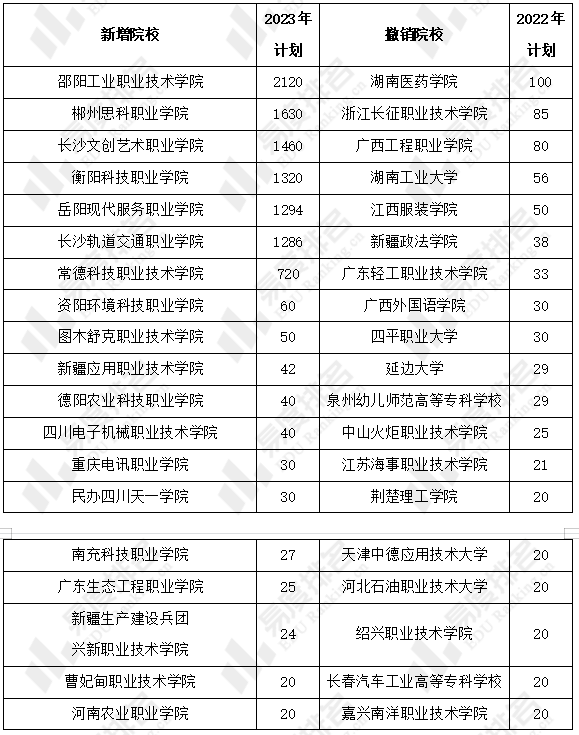 表 1 2023年湖南高考新增与撤销院校TOP20(专科普通类招生)