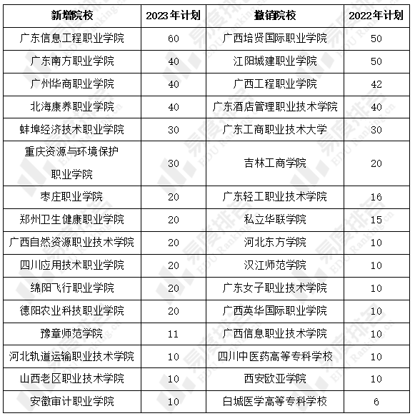 表 1 2023年海南高考新增与撤销院校(专科普通类招生)