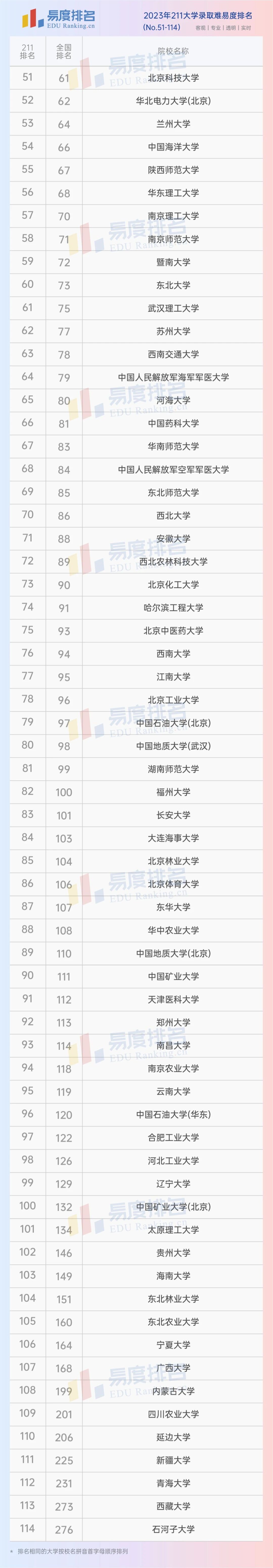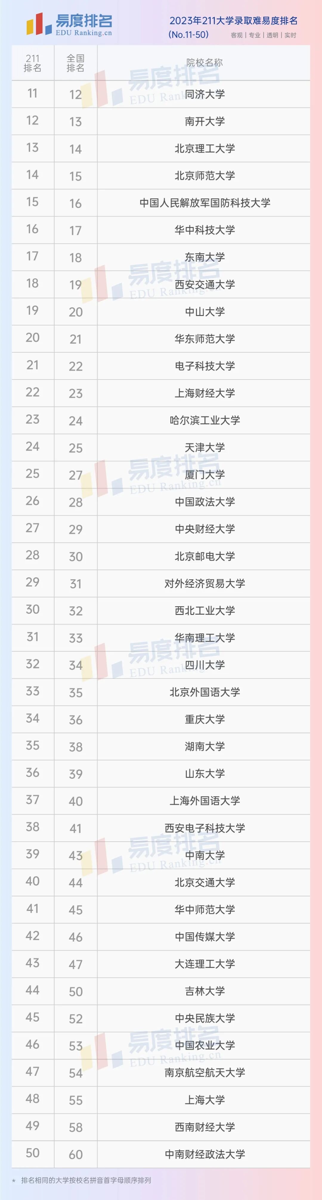 2019年11月28日,教育部声明:已将“211工程”和“985工程”等重点建设项目统筹为“双一流”建设,即“双一流”大学包含所有985和211大学。本期易度排名将公布“2023年211大学录取难易度排名”完整榜单,一起来了解这些大学的录取难度究竟如何。