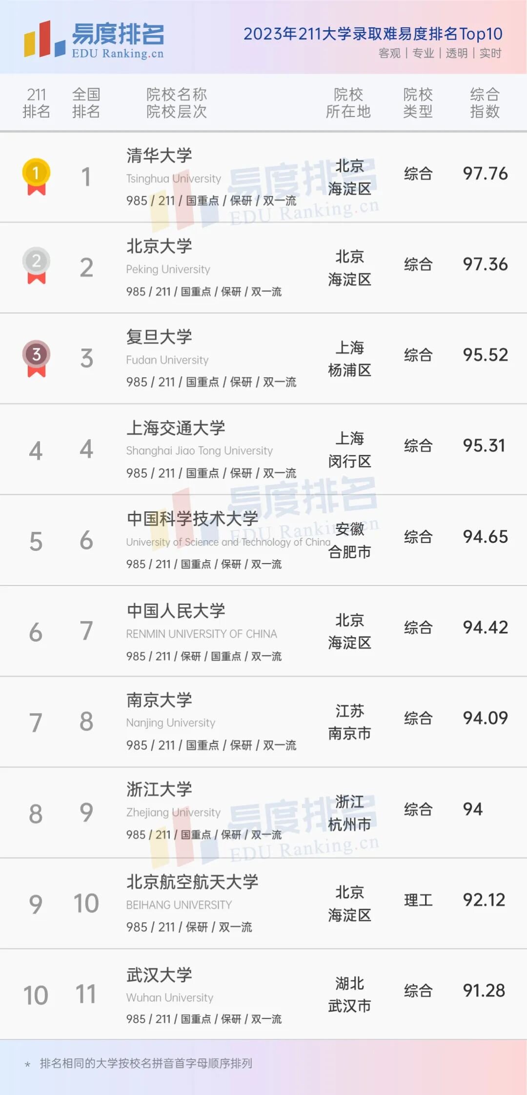 “2023年211大学录取难易度排名”的对象是中国114所本科级院校。清北这两所院校毋庸置疑为排行榜的冠亚军,复旦大学近两年有所进步,超越了往年第三名的上海交大。
