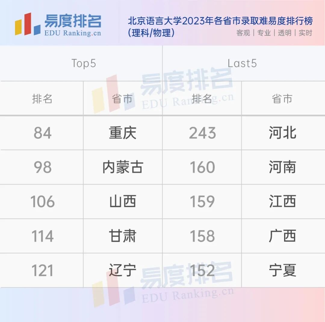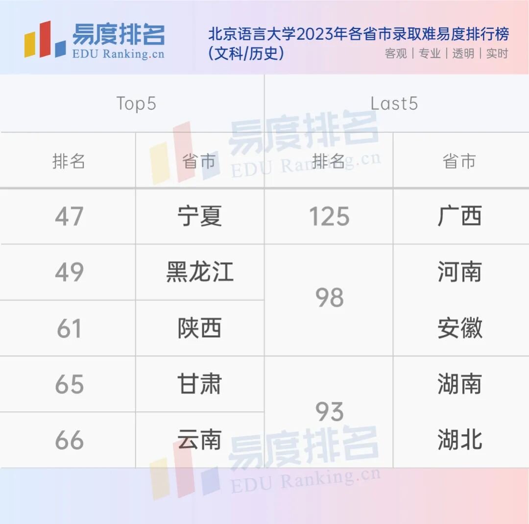 北京语言大学在“2023年各省市录取难易度排行榜”中的物理/理科和历史/文科方向排名前五和最后五名的省市,历史/文科方向比物理/理科方向难度高出很多,其中宁夏、黑龙江考生报考难度较大,广西考生报考的性价比更高。北京语言大学在北京市的录取难易度为93名。
