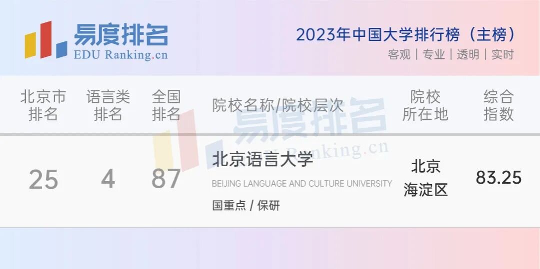 北京语言大学在“2023年中国大学排行榜(主榜)”中的名次,对比近六年在全国的排名,确实有明显下降,这与现在社会趋势有着很大的关系,近些年it、通信、电子类高校行情见长,财经类和语言类院校自然有所下滑,报考北语的热度自然也降低了。当然,这并不影响其在语言类院校中的地位,依然是仅次于北外、上外和中传的存在,连续六年夺得榜单第四名。
