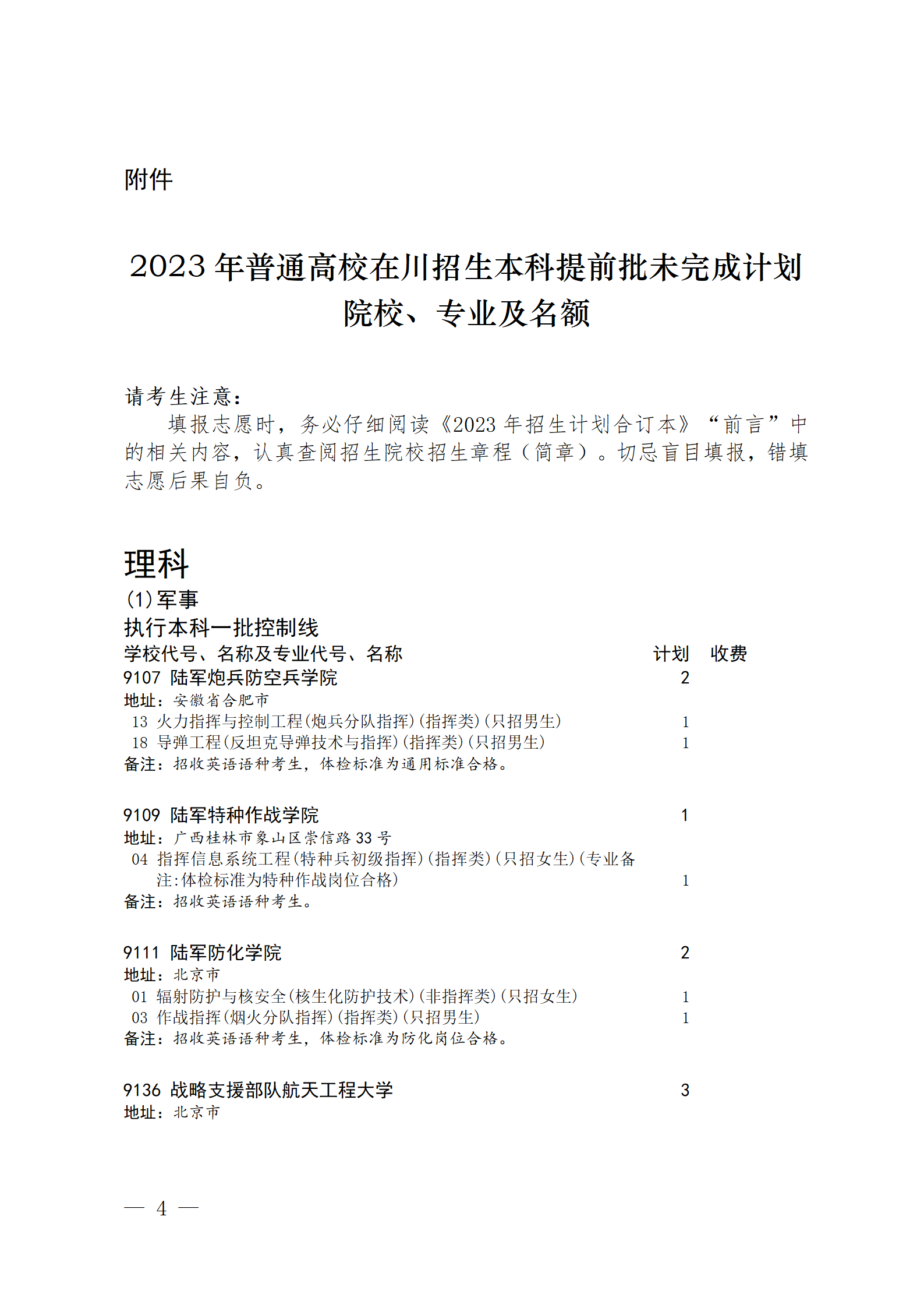 四川2023年关于本科提前批未完成计划院校征集志愿的通知