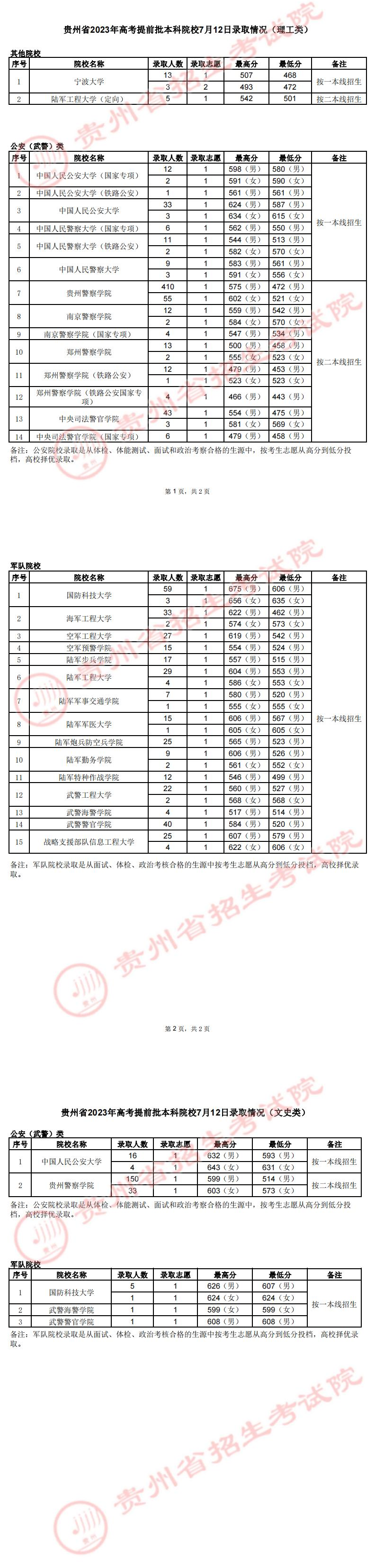 贵州省2023年高考提前批本科院校7月12日录取情况