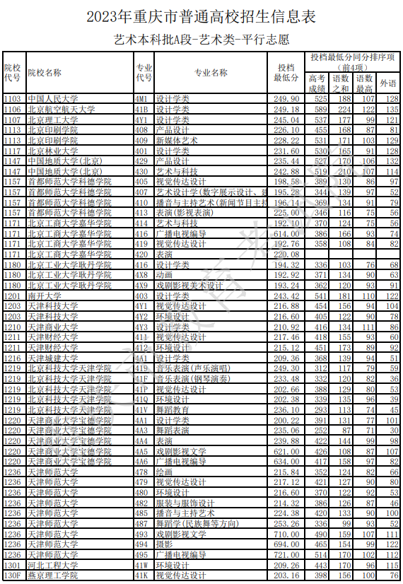 2023重庆普通高校招生信息表-艺术本科批A段-艺术类-平行志愿