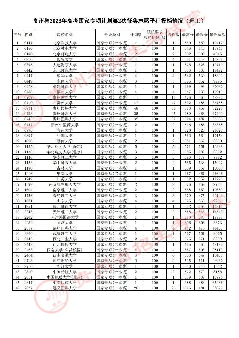 贵州省2023年高考国家专项计划第2次征集志愿平行投档情况