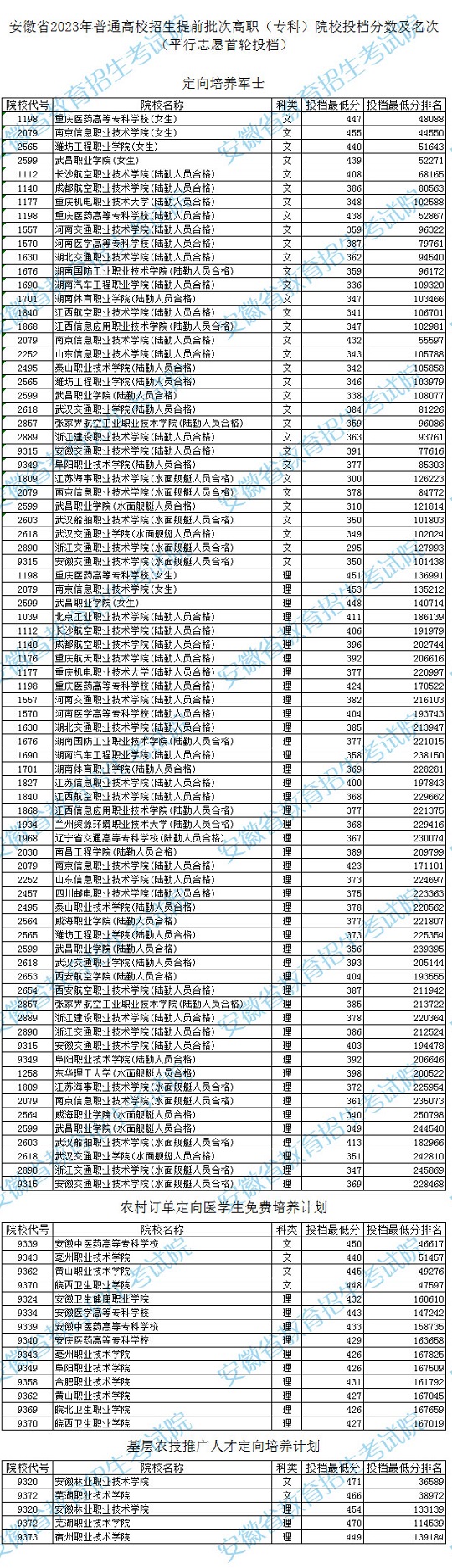 安徽2023年提前批高职(专科)平行志愿投档最低分排名