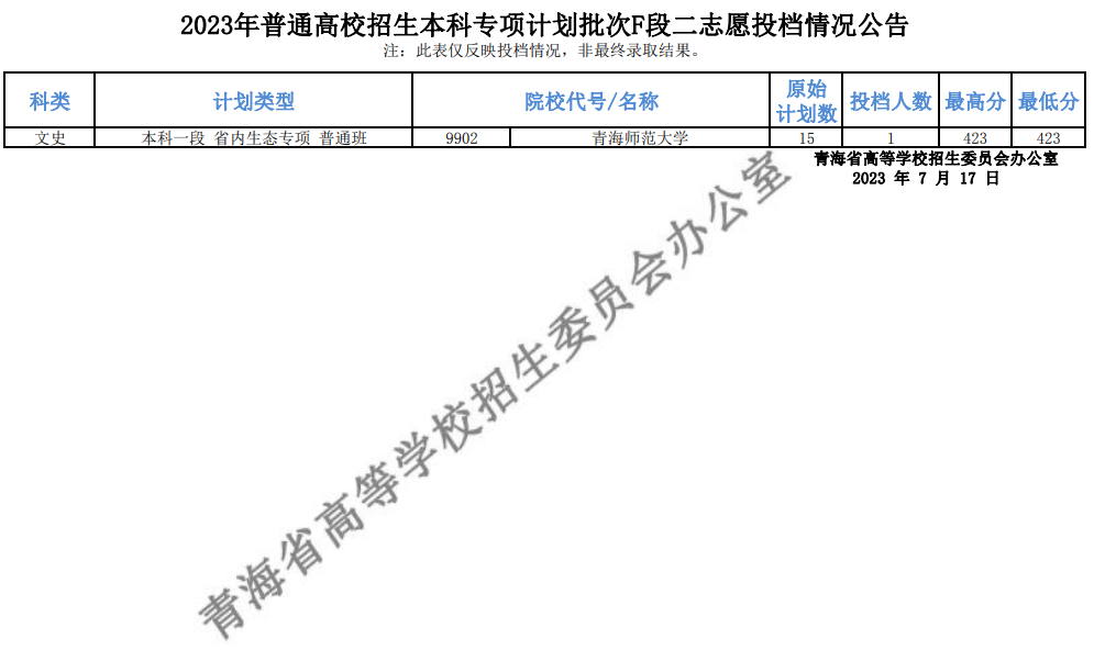 青海2023年普通高校招生本科专项计划批次F段二志愿投档情况公告