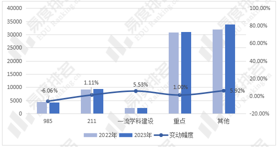 2023年除985院校外,其他各层次的院校均上调了招生计划,其中其他院校的招生增幅最大,约为6%。985院校中南京大学2023年不再按普通专业或专业类进行材料类专业的招生,所有材料类专业均在试验班中招生。