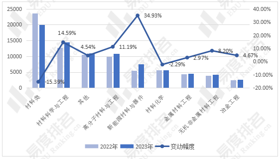 本文将通过2022年和2023年全国高考普通本科批的招生计划数来分析材料类专业的招生变动情况。本文只讨论普通本科批的招生计划,强基计划、提前批、艺术类、体育类等招生方式产生的招生计划不在本文讨论范围内。