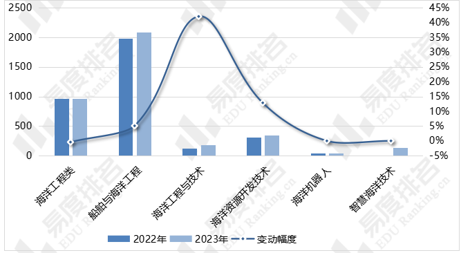 图 1 2022-2023年全国海洋工程类专业招生计划数增长情况
