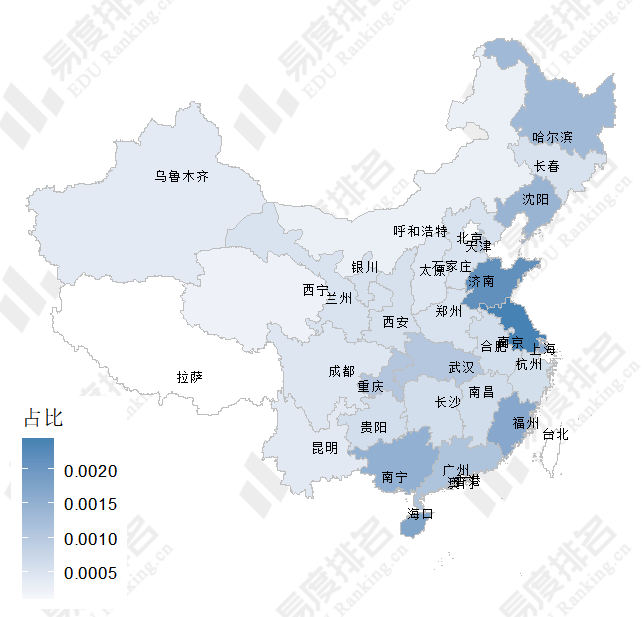 下图展示了全国各省(市,自治区)海洋工程类专业招生计划数占比,全国各省(市,自治区)海洋工程类专业招生计划数占比在0.01%和0.3%之间。江苏、山东等地为沿海地区,海洋资源丰富,对海洋工程类人才的需求量较高。