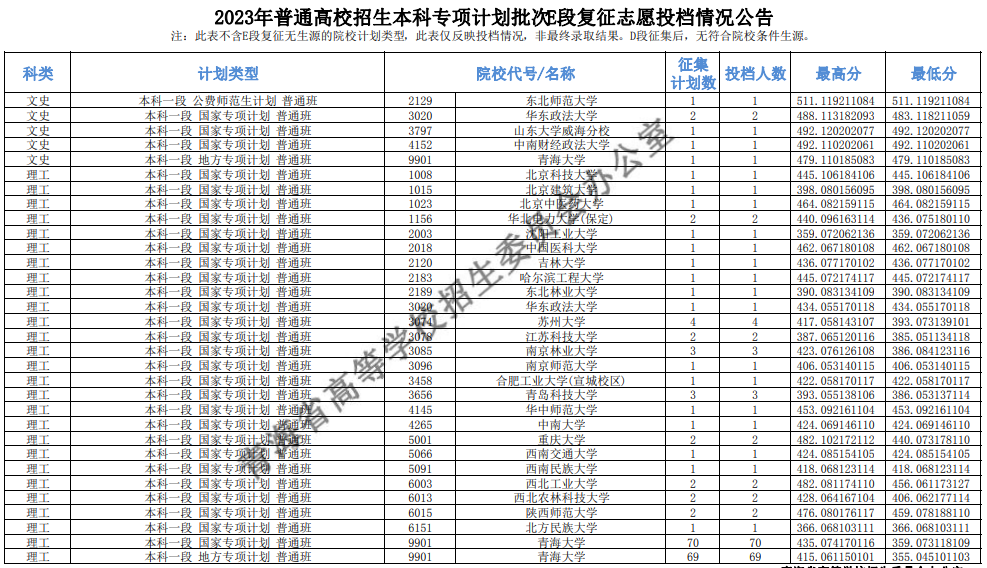 青海省2023年普通高校招生本科专项计划批次E段复征志愿投档情况公告